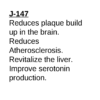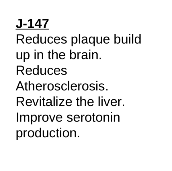 To summarize: J-147 has demonstrated to reduce plaque buildup in the brain, reduce free fatty acids in the blood, aids in repair of fatty liver, reduces atherosclerosis, and improves production of serotonin.