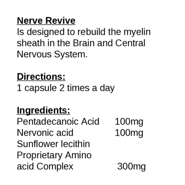 Nerve Revive is designed to rebuild the Myelin Sheath in the brain.  We are using Pentadecanoic acid AKA (Fatty 15), Nervonic Acid from Purple Blow Maple Tree (Acer Truncatum), and Sunflower Lecithin.